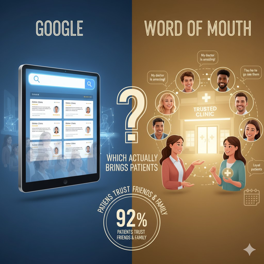 Google vs Word of Mouth: Which Actually Brings Patients If you are a doctor or run a clinic, you want new patients to find you fast.But what works better: Google or Word of Mouth (WOM)? Let’s break it down in simple words. What Is the Word of Mouth? Word of mouth is when your patients tell their friends and family about you. They share their good experiences. They tell others to visit your clinic. Why It Works So Well I see that 92% of patients trust recommendations from friends and family. This trust is very strong. Patients believe what their loved ones tell them. When someone I trust tells me about a good doctor, I listen. This is natural. We trust people we care about. The Good Things About Word of Mouth Patients trust it more than ads. When my friend tells me about a great doctor, I trust them. I don’t trust TV ads the same way. It costs me nothing. I don’t pay for ads. My happy patients do the talking for me. It brings loyal patients. Referred patients are 50% more likely to make a second purchase. They stay with my practice longer. It keeps working. One happy patient tells others. Those new patients tell more people. It keeps growing.   The Problems With Word of Mouth It is slow. One person can only tell a few friends. It takes time to reach many people. I can’t control it. I can’t make patients talk about me. I can’t choose what they say. Bad news spreads too. If one patient has a bad time, they might tell others. This can hurt my practice. It’s hard to track. I don’t always know how patients heard about me. I can’t measure it easily. Facts About Word of Mouth in Healthcare 97.9% of patients will recommend their family doctor to friends and family. This shows how powerful word of mouth is in healthcare. 84% of patients used recommendations from other patients when searching for their doctor. This means most patients ask others before choosing a doctor. Research shows that word-of-mouth referrals are effective due to their inherent trust. Patients believe other patients more than they believe ads. What This Means Word of mouth is still very important. Even in our digital world, patients trust what other patients say. I need to focus on making patients happy. Happy patients talk about good experiences. They bring me new patients without me paying for ads. But I can’t rely only on word of mouth. It’s too slow. I need other ways to bring patients faster too. What is Google Search Marketing? I use Google to help patients find my practice when they search online. When someone types “doctor near me” or “dentist in my city,” Google shows them results. My practice needs to show up in these results. How Fast Does Google Work? Google is very fast. When I put my practice online and within minutes hundreds of people can find me in minutes. It is 24/7. I don’t have to wait for people to tell their friends about me. The Real Numbers Here are the facts about how patients use Google: 65% of patients search online before contacting a doctor Two-thirds of all patients search the internet prior to a health consultation 76% of patients go online to seek out information on an individual provider 81% of people research businesses using Google Reviews Google Reviews Are Important Reviews on Google matter a lot. Here’s what I need to know: 73% of patients consider online reviews when selecting a healthcare provider 72% of patients only choose doctors with 4-star reviews or higher Over 34% of Google reviews are for healthcare services Google maintains dominance at 84.03% awareness in 2025 What This Means When patients need a doctor, they go to Google first. They don’t ask friends anymore. They type what they need and pick from the results they see. If my practice is not on Google, patients cannot find me. They will pick another doctor who shows up in their search. The Hurdle Every Clinic Sees The bad news is simple. If I don’t show up on Google, I don’t exist to new patients. 65% of general practitioners have no online reviews. This means many doctors are invisible to patients who search online. From Search to Appointment in Minutes Google is always working. It shows my practice to people who are ready to book an appointment right now. They already decided they need a doctor. They need to find the right one. Word of mouth takes time. Google works today. What I Need To Do I need to make sure: My practice shows up when people search I have good reviews from happy patients My information is correct on Google I respond to patient questions fast The numbers are clear. Most patients will find me on Google or they won’t find me at all. Speed: Who Wins? Google Wins for Speed When people need a doctor, they search online right away. Google gets more than 1 billion health questions every day – that’s about 70,000 searches per minute. Here’s what studies show: 89% of people use Google Search for health needs, only 11% use word of mouth or direct go to websites . 58.5% of adults search online for health information Two-thirds of all patients search the internet before visiting a doctor Google: The Shortcut to Patient Flow When someone feels sick or has pain, I’ve noticed they don’t wait to ask friends. They grab their phone and search right away. Search brings 3 times more visitors to hospital websites than to people who don’t search. Google works fast because: People search when they need help now Results show up in seconds They can book appointments the same day Word of Mouth Takes Time, But Its Value Lasts Word of mouth takes time. A patient must: Feel happy with their care Talk to friends and family Friends must need the same type of … Read more