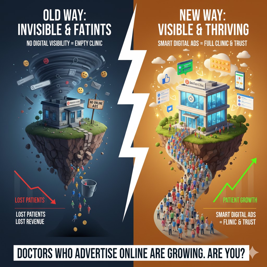 Doctors Who Don’t Advertise Online Are Falling Behind Every Month You spent years studying medicine. You worked long hours during your residency. You saved money and opened your own clinic. You bought good equipment and hired caring staff. Everything was ready for patients to come. But something changed in the last few years. Walk-in patients became fewer. Your phone rings less than before. Some days you sit in your cabin waiting for appointments that never come. Your clinic has empty slots that could bring income but stay blank instead. You wonder what went wrong. The answer is not about your skills or your care. You are still the same good doctor you always were. The problem is where patients look for doctors now. They do not ask neighbors anymore. They do not flip through phone books or look at newspaper ads. They pick up their phones and search online. When someone needs a doctor today, they type on Google. They ask their questions and wait for answers. Within seconds, they see a list of clinics. They click on the first few names. They read reviews and check websites. They book appointments with doctors who show up in those search results. If your name is not there, they will never find you. This shift happened slowly but completely. Research from Google India shows that 77% of patients now search online before choosing a healthcare provider. That means eight out of every ten sick people start their search on the internet, not by asking friends or family. They look for symptoms, treatments, and doctors all in one place. Another study from the Indian Medical Association found something worrying. Clinics without any online presence lost an average of 30% of their patient flow between 2022 and 2024. Meanwhile, clinics with active online advertising grew their patient numbers by 45% in the same period. The gap between online and offline doctors keeps getting bigger every single month. Think about your own behavior when you need something. Maybe you wanted a plumber last month. Maybe you looked for a good restaurant last week. Where did you search first? You probably used your phone. You typed your need into Google or asked in a WhatsApp group. You trusted what you found online more than old memories or distant recommendations. Your patients do the same thing when they feel sick. A mother whose child has fever at night does not wait till morning to ask her neighbor. She searches for a pediatrician near her right away. A man with chest pain does not remember which cardiologist his uncle visited five years ago. He searches for the best heart doctor in his area immediately. If you are not online, these patients never see your name. They never know you exist. They book with someone else who showed up in their search. You lose that patient forever. Worse, you lose all the future visits that patient would have made. You lose the family members they would have referred to you. Many doctors feel uncomfortable with online advertising. They believe good work speaks for itself. They think patients will find them through reputation and word of mouth. That belief was true twenty years ago. Today it costs you patients and income every single day. Word of mouth still matters, but it moves slower than online search. By the time someone hears about you from a friend, they already booked an appointment somewhere else. Online ads work faster. They catch patients at the exact moment when they need help. That speed makes all the difference in a competitive market. Some doctors worry that advertising makes them look desperate or unprofessional. They feel that marketing is below their dignity as healers. But advertising is not about desperation. It is about visibility. You cannot help patients who cannot find you. Being visible online is not showing off. It is showing up where your patients already are. Right now, while you read this, someone in your city is searching for the exact services you provide. They need your expertise. They would benefit from your care. But they will never reach you because your competitor runs Google Ads and you do not. That competitor will treat them, earn their trust, and keep them as long-term patients. All because they decided to be visible online. The gap between doctors who advertise and doctors who do not keeps growing. Every month you delay, your competitors get stronger. They fill their schedules. They hire more staff. They expand their clinics. Meanwhile, you work harder to fill the same appointment slots you had last year. Hard work alone cannot fix a visibility problem. This article will show you exactly what happens when doctors ignore online advertising. You will see real data and real examples from clinics across India. You will understand why patients choose online doctors over offline ones. You will learn what you lose every month by staying invisible. Most importantly, you will see what changes when you finally decide to show up where your patients are looking. 1.) The Truth: Your Patients Are Online, Not in the Waiting Room People Search for Doctors Every Single Day, But They Find Your Competitors First Your clinic opens at 9 in the morning. You check the appointment book and see empty slots scattered through the day. Maybe three patients booked for the afternoon. The rest of your time sits blank and waiting. You wonder where all the patients went. Here is the truth that changes everything. Your patients did not disappear. They moved online. Right now, while you read this, someone in your neighborhood is typing “best doctor near me” into Google. Another person is scrolling Facebook looking for a good pediatrician. A third person is asking on a WhatsApp group for dentist recommendations. These people need a doctor. They have pain, worry, or health questions that keep them up at night. They want help from someone they can trust. But they will never know you exist if you … Read more