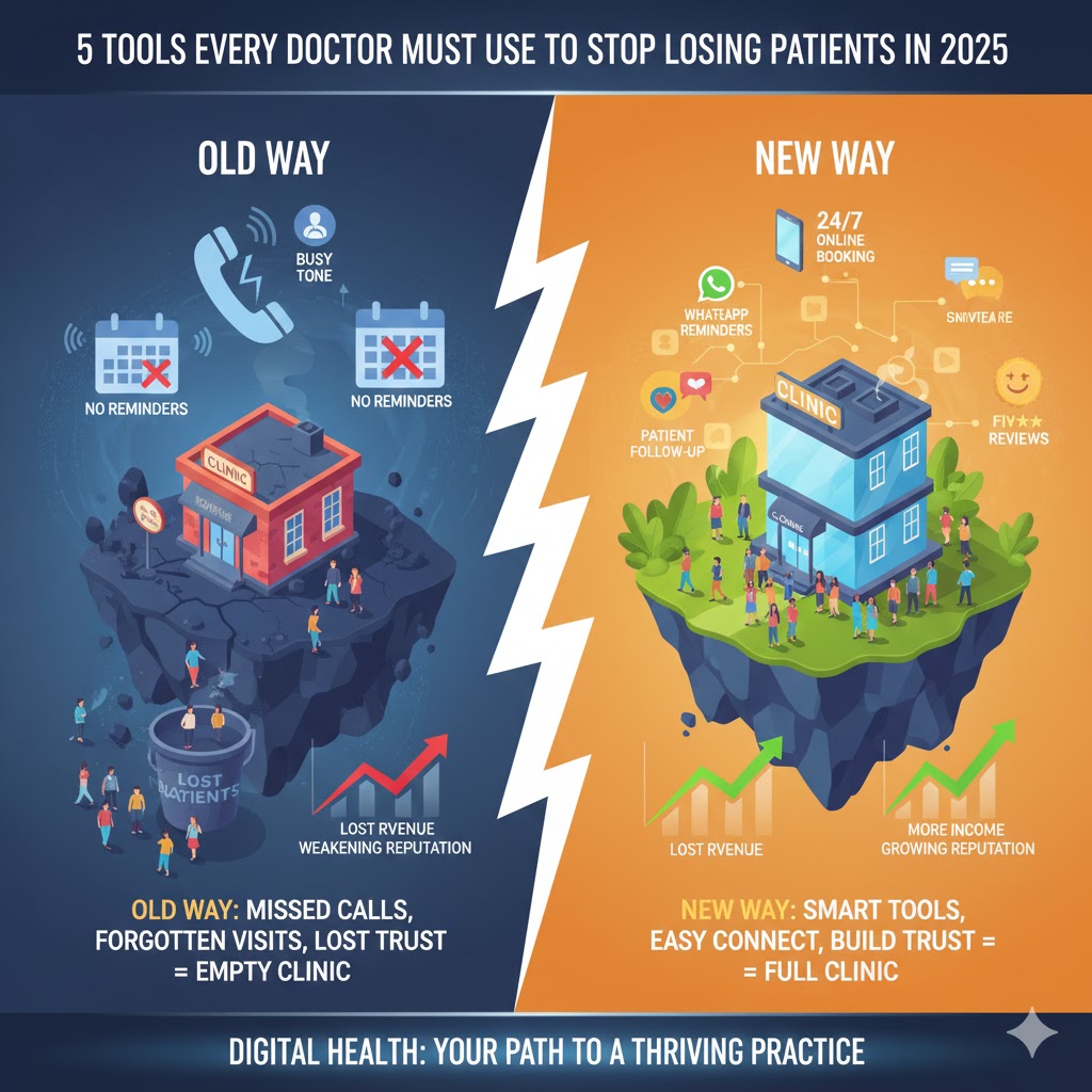 5 Tools Every Doctor Must Use to Stop Losing Patients in 2025 Every week, your clinic loses patients. Not because of bad treatment. Not because of high fees. They leave because staying connected feels too hard. A patient needs a follow-up appointment. She calls your clinic three times. Nobody picks up. She gives up and finds another doctor. Another patient forgets his appointment date. No reminder comes. He misses the visit. He feels embarrassed to call back. One more patient recovers after surgery. Nobody checks how she’s doing. She feels forgotten. Next time, she tries a different clinic. The Cost of Losing Patients Adds Up Fast When patients stop coming back, your practice suffers. Empty appointment slots mean less income. Your reputation weakens when patients switch to competitors. Research shows that keeping an existing patient costs five times less than finding a new one. Yet most clinics spend all their energy attracting new patients. They forget about the ones they already have. Indian healthcare data reveals something alarming. About 40% of patients never return after their first visit. They don’t complain. They don’t give feedback. They simply disappear. The Real Problem Is Not Your Medical Skills You are a good doctor. Your patients get better under your care. The problem is everything that happens outside the treatment room. Booking an appointment feels difficult. Getting reminders never happens. Follow-up care gets forgotten. Sharing feedback seems impossible. These small gaps push patients away slowly. One missed call here. One forgotten follow-up there. Over months, your patient list shrinks. Technology Can Fix What Your Staff Cannot Your team works hard already. They answer phones. They manage files. They handle billing. Adding more tasks will only burn them out. This is where smart digital tools come in. They handle the boring, repetitive work. Your staff focuses on caring for patients face to face. These tools work 24 hours a day. They never take breaks. They never forget. They cost less than hiring more people. Five Simple Tools That Change Everything The right digital tools stop patients from slipping away. They keep your schedule full. They make your clinic run smoother. They help you earn more without working harder. In 2025, these five tools are not optional anymore. They are necessary for survival. Clinics using them grow faster. Clinics ignoring them fall behind. Let’s look at each tool. Understand what it does. See how it saves your practice. Learn why you need it starting today. 1.) Online Booking Made Simple Your patients want to book appointments when it suits them. Not when your clinic is open. Not when your staff can answer phones. Let Patients Book Anytime They Want Think about your busiest patients. They work during the day. They have meetings. They cannot call during your clinic hours. By evening, your phones are off. Online booking solves this problem completely. Patients can book at 11 PM while lying in bed. They can book at 6 AM before work starts. Your calendar fills up even when you sleep. Data shows 67% of patients prefer booking appointments online over phone calls. They want control. They want speed. They want convenience. Your Phone Stops Ringing All Day Phone calls interrupt your staff constantly. Your receptionist answers the same questions twenty times daily. What are your timings? Which slots are free? Do you treat this condition? Online booking systems handle all these questions automatically. Your staff can focus on patients who actually visit. They can manage files better. They can give attention to people in front of them. Clinics report 50% fewer phone calls after adding online booking. That means less stress for your team. Better service for everyone. Fill More Slots Without Extra Effort Empty appointment slots mean lost money. Every unfilled hour is income you cannot recover. Traditional booking methods leave gaps in your schedule. Smart booking tools show patients all available slots in real time. They pick what works for them. Your calendar stays packed. Your income stays steady. Studies reveal clinics with online booking see 25% more appointments monthly. More patients mean more revenue. Your practice grows faster. Patients Book Faster Than Ever Before The old method takes time. The patient calls your clinic. Staff checks the register. They suggest times. The patient thinks and calls back later. Slot might be gone by then. The new method takes two minutes. The patient opens your booking page. They see free slots. They pick one. Done. Confirmation arrives on their phone immediately. Speed matters in healthcare. When patients need help, they want quick action. Online booking gives them that power. They feel satisfied. They trust your clinic more. Works on Every Device Patients Use Your patients carry smartphones everywhere. They check WhatsApp. They browse Facebook. They shop online. Your booking system should work on these devices too. Good booking tools work on phones, tablets, and computers. The screen adjusts to any size. Buttons are big and clear. Even older patients can use them without confusion. Mobile booking is crucial in India where 85% of internet users browse on phones. Your system must match how patients live their daily lives. Stop Losing Patients to Competitors Other clinics in your area are going digital. They offer online booking. They look modern and professional. Patients compare before choosing. If your clinic still relies on phone calls only, you fall behind. Young families pick clinics with easy booking. Working professionals choose convenience over everything else. Market research shows 40% of patients switch doctors due to booking difficulties. You cannot afford to lose patients over something this simple. Set It Up Once and Forget About It Many doctors worry about technical setup. They think online systems are complicated. They fear managing another platform daily. Modern booking tools need minimal s