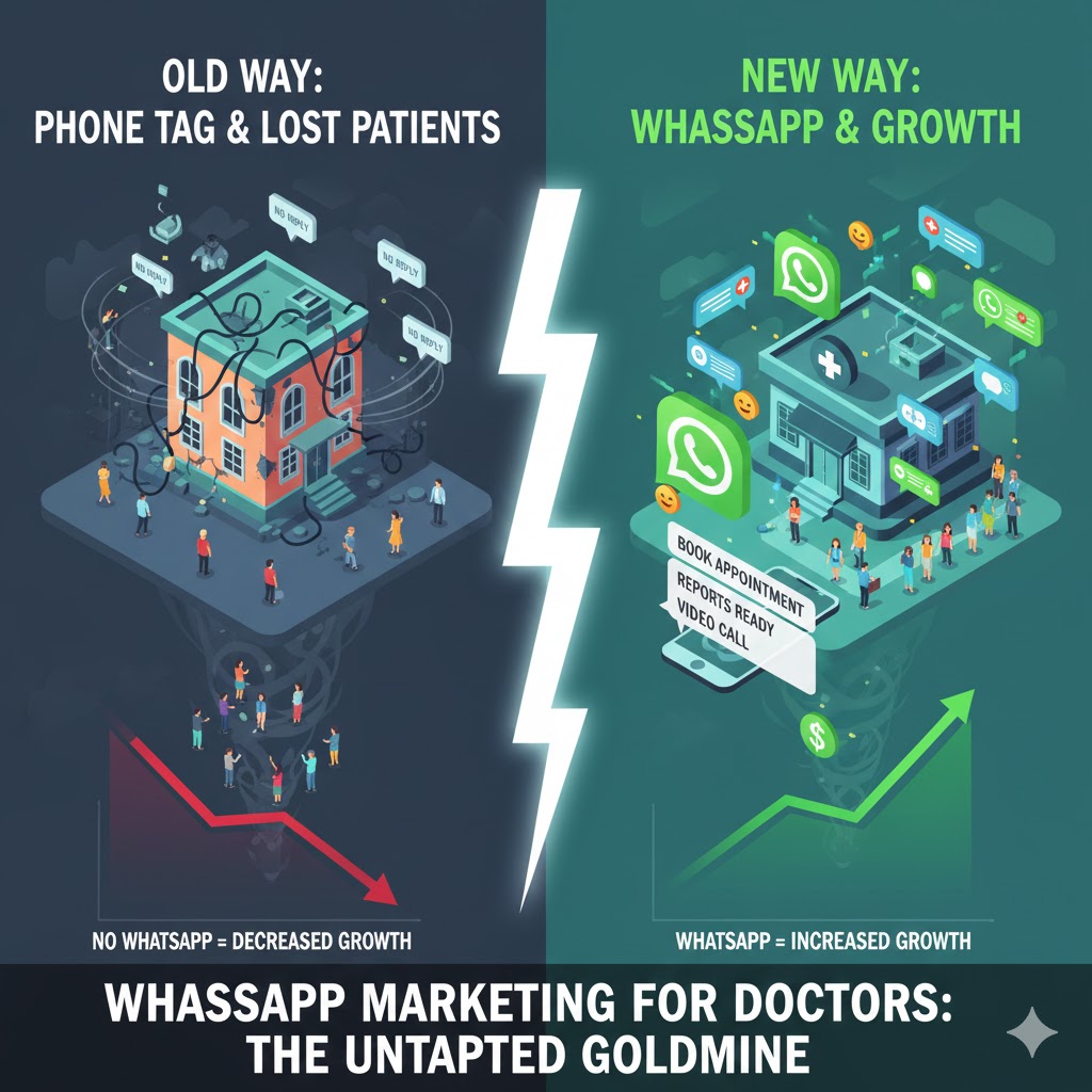 WhatsApp Marketing for Doctors: The Untapped Goldmine Healthcare in India is changing now. Patients want easy ways to talk with their doctors. Phone calls and long waits make many people angry today. Over 480 million people in India use WhatsApp every day. WhatsApp is not where people chat. It is how people talk to each other now. Doctors in India are learning something great. Their patients like WhatsApp messages better than phone calls for health questions. This change is making new chances for doctors everywhere. Smart doctors are using this to make their clinics grow. Why WhatsApp Changes Everything for Doctors Think about your day. When do you check WhatsApp? Most people read their messages in a few minutes. New data shows 71% of Indian doctors like WhatsApp better than email. This shows how strong WhatsApp can be for talking about health. Patients feel better asking health questions through WhatsApp. They can think about what to write before they type. This helps them tell their problems better. Doctors can give better help when patients talk clearly about what hurts. Calling clinics during busy times makes problems. Patients wait while staff take many calls. Many people stop waiting and never book visits. WhatsApp fixes this by letting patients send messages anytime. The Trust Factor That Changes Everything WhatsApp builds trust between doctors and patients in good ways. When patients see a doctor’s picture and name, they feel closer. Personal messages feel warmer than cold emails or machine calls. Patients want fast replies, easy bookings, and simple follow ups. Clinics that use WhatsApp well are building better trust. This trust brings more visits and better relationships with time. Patients share WhatsApp messages with family members easily. When your health advice helps one person, their whole family sees it. This talk brings new patients to your clinic by itself. The Numbers That Prove WhatsApp Works Over 500 million people in India use WhatsApp. WhatsApp marketing for health care in India works very well for hospitals and clinics. It costs less money and works better. These numbers show the big chance waiting for doctors. Most Indians use WhatsApp more than any other app. They check messages many times each day. This means your health tips and visit reminders reach patients when they will read them. The Digital Health market in India will grow by 11.83% from 2025 to 2029. It will be worth 9.90 billion dollars by 2029. This growth shows that digital health tools are becoming needed for all doctors. WhatsApp for doctors does more than simple text messages. Smart clinics use it for booking visits, sending test results, and sharing health tips. Patients love getting health advice that helps them stay well between visits. Doctors can make groups for patients with the same sickness. Diabetes patients can get sugar tips together. Heart patients can share healthy food ideas. This makes groups that help each other. Video calls through WhatsApp help doctors do quick check ups. Patients can show their healing cuts or ask about medicine problems. This saves time for doctors and patients while giving better care. The Competitive Edge Most doctors in India still use old ways to talk. Phone calls, text messages, and emails feel old to young patients. One study by Deloitte shows 24% of people would change to a doctor with better digital talking. Doctors using WhatsApp marketing early are seeing great results. Their clinics stay busy while other doctors fight to keep patients interested. This early start makes long term benefits for smart doctors. Patients tell their friends about doctors who talk well through WhatsApp. This good talk brings steady growth without costly ads. The happy patients become your best marketing helpers. The Untapped Goldmine Awaits Many good doctors have not started using WhatsApp for their work yet. They worry about hard tech stuff or time problems. But doctors who use this tool early will get the most benefits. More than 50% have joined medical talks or health updates sent through WhatsApp. This is not a short trend. It is a change in how medical talking is done. The change is happening whether doctors join or not. The goldmine exists because patients want it but doctors do not give it. Most patients want WhatsApp talking with their doctors. Few doctors offer this yet. This makes a perfect chance for growth. The time to start is now. Every day you wait, more patients pick doctors who offer modern talking ways. WhatsApp marketing for doctors is not extra anymore. It is needed to stay strong in modern healthcare. 1. Connecting with Patients Made Easy Everyone Uses WhatsApp Every Day India has 853 million people using WhatsApp. Almost every patient who comes to your clinic has WhatsApp. They look at their phone many times each day. Your patients check WhatsApp when they drink tea in the morning. They send messages to their families all day long. They share photos with friends at night. WhatsApp is part of what they do every day. When you send a WhatsApp message, patients see it fast. They do not forget to check like they do with emails. They do not wait for letters to come in the mail. Your message shows up where they already look every day. People send 7 billion voice messages on WhatsApp every day. This shows people like to use WhatsApp to talk to others. Patients trust WhatsApp because they use it for important things in life. Reaching Patients Where They Are Old ways of talking to patients are hard. Phone calls need both people to be free at the same time. Emails get lost or people forget to check them. Text messages feel too formal and cold. WhatsApp makes talking to patients easy. Patients can read your messages during lunch at work. They can reply to appointment reminders while on the bus. They can ask health questions from home at night. Before WhatsApp, 66% of patients said talking with doctors was not good enough. WhatsApp fixes this by … Read more