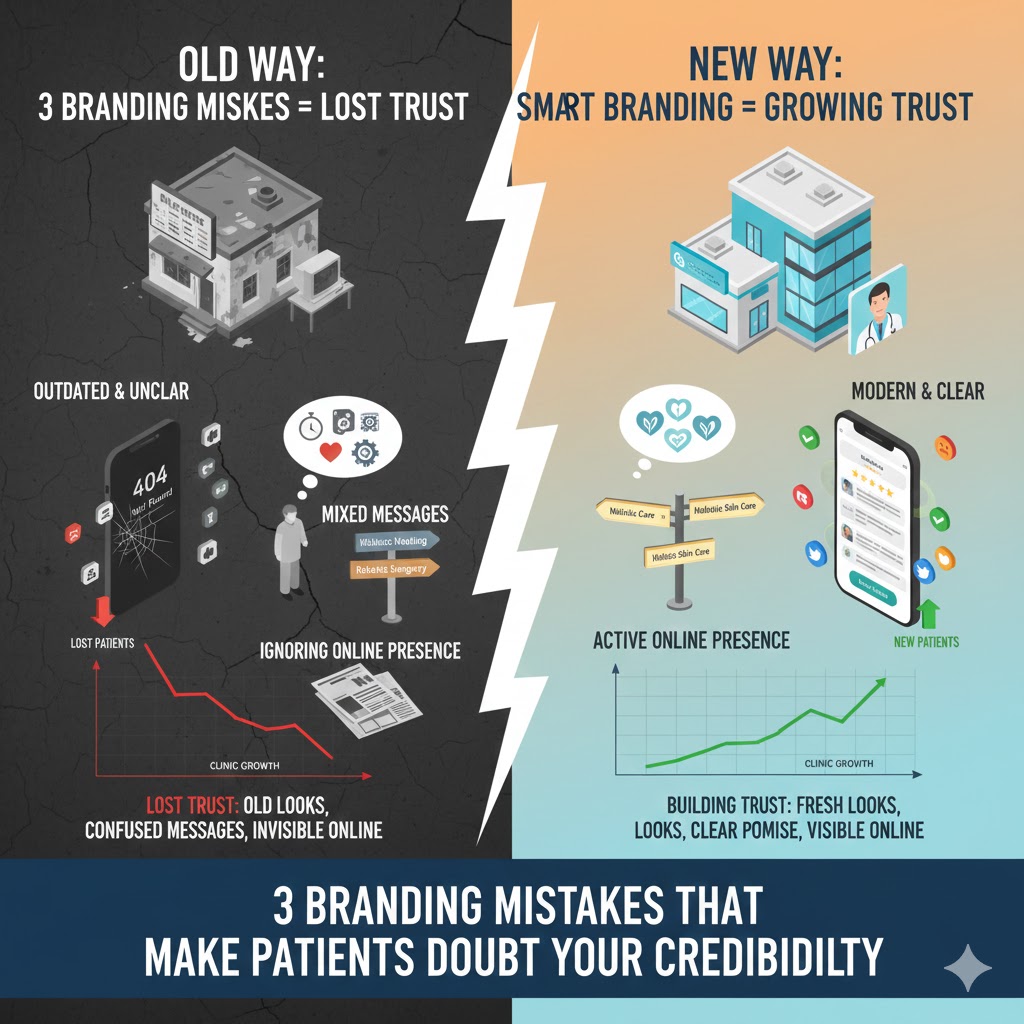 3 Branding Mistakes That Make Patients Doubt Your Credibility Your clinic’s brand is built to heal patients and save lives. But small mistakes are breaking patient trust every single day. Over 60% of Indian patients find it hard to trust hospitals today. The numbers tell a scary story about healthcare in India. Patients walk into clinics feeling worried about getting good care. Trust in medical institutions has dropped badly over the last ten years. This trust crisis hits doctors and clinics hard across the country. Patients now question everything before choosing their healthcare provider. Your brand reputation decides if patients pick your clinic over others. Strong branding builds the trust that patients need to feel safe. When branding goes wrong, patients lose faith in your medical skills too. Many clinics have no clear brand identity that patients can remember. Without good branding, patients cannot tell your clinic apart from others. This makes them choose based on price alone or avoid you completely. The healthcare market in India grows bigger every year. More clinics open and compete for the same patients in every city. Your brand becomes the main thing that makes patients choose you first. Smart branding helps patients trust you before they even meet you. It shows them that your clinic cares about quality and patient safety. Good branding also helps patients remember your name when they need help. But many doctors and clinic owners make branding mistakes without knowing it. These mistakes push patients away and hurt your clinic’s growth every day. The wrong branding choices can destroy years of hard medical work. Patient trust starts the moment they see your clinic’s name or logo. It grows stronger through every interaction they have with your brand. When trust breaks, patients leave and never come back to your clinic. This article will show you three big branding mistakes that harm patient trust. Each mistake stops patients from choosing your clinic over your competitors. Learning about these mistakes will help you fix them fast. Your clinic’s future depends on patients trusting your medical care and expertise. Strong branding makes that trust grow stronger every single day with patients. 1. Looking Outdated or Unclear When patients walk into your clinic, what do they see first? Your brand tells them everything before you even speak. A tired looking logo or faded colors send the wrong message instantly. Think about the last time you visited a restaurant with peeling paint. Did you wonder about their food safety? Patients think the same way about healthcare. Outdated branding makes them question your medical care quality. Healthcare practices across India are losing patients before they even walk through the door. The problem starts with how your clinic looks to the outside world. A study by Stanford showed that 75% of people judge medical credibility by visual design. Your outdated logo tells patients you might use outdated treatment methods too. Think about the last time you saw a clinic with faded signboards. Did it make you feel confident about their medical equipment? Probably not. Colors That Kill Confidence Dull browns and grays make your practice look tired. Patients want to see energy and life in healthcare spaces. Fresh blues and clean whites suggest cleanliness and modern care. Research from the Healthcare Marketing Association found that clinics using bright, clean colors get 40% more appointment bookings than those with dull designs. Messy Designs Create Medical Doubts When your clinic poster has too many fonts, patients get confused. If you cannot organize a simple sign, how can you organize their treatment plan? Studies show that 94% of first impressions relate to visual design elements. Your clinic logo works like your medical degree on the wall. Both build confidence in your expertise and professionalism. Old fashioned fonts suggest old fashioned methods to worried patients. Dull brown and beige colors feel stale and uninviting. Bright, clean colors create feelings of health and healing instead. Clear, simple designs work better. One main message. One easy font. One strong image. This approach helps patients understand your services quickly. Your Reception Area Speaks First Your reception area logo gets seen by every single patient. Faded or pixelated designs look unprofessional and careless to visitors. Sharp, clear graphics show attention to detail and quality standards. Color choices affect patient emotions more than most doctors realize. Green shades promote calm and natural healing feelings in patients. Blue tones build trust and suggest medical expertise and reliability. Before patients meet you, they see your walls. Peeling paint and crooked frames suggest poor attention to detail. Patients wonder if you will be careless with their health too. A clean waiting room with updated displays shows you care about every detail. This builds trust even before the consultation begins. Logo Problems That Push Patients Away Old medical symbols like the red cross are now overused. Patients see these symbols everywhere and your clinic gets lost in the crowd. Confusing layouts make patients feel lost before their appointment starts. Many font styles create visual chaos that increases patient stress. Simple, organized designs help patients feel more comfortable and confident. When your brand looks messy, patients wonder about your organization. They ask themselves if disorganized branding means disorganized patient care. Clear visual systems suggest clear medical processes and reliable service. Modern healthcare logos use unique shapes and colors. They stand out and stay in patient memory longer. The Trust Factor Visual branding creates the first impression of your medical skills. Patients cannot judge your 15 years of experience from looking at you. But they can judge your attention to quality from your clinic appearance. Updated, clear branding shows patients y