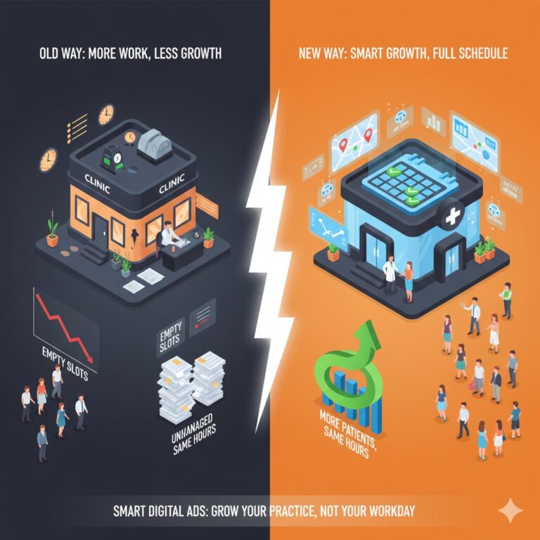 Meanwhile, the clinic two streets away runs Google Ads. Their name appears at the top when someone searches for “fever doctor near me.” Their Facebook page shows helpful health tips and patient testimonials. Their Instagram has photos of a clean, friendly clinic. That clinic looks busy, trusted, and modern. The patient books there without ever seeing your name.