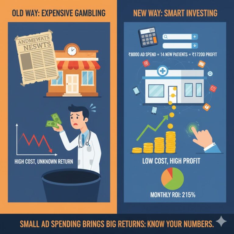 The truth is different. You do not need a huge budget to see real results. Small monthly spending of 5000 to 10000 rupees can bring 10 to 20 new patients. Those patients spend an average of 1000 to 2000 rupees per visit. Your return covers your ad cost many times over.