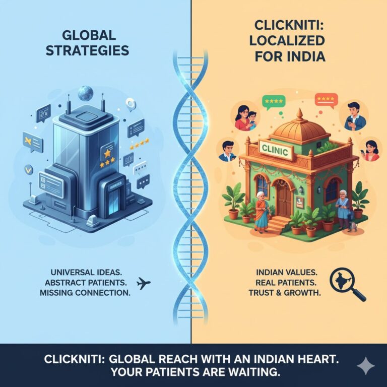 The world talks about healthcare marketing in one way. But India is different. Your patients speak Hindi or Tamil. They trust word of mouth more than any advertisement. They live in cities, towns, and villages. What works in America or Europe may not work here. This is where Clickniti comes in.