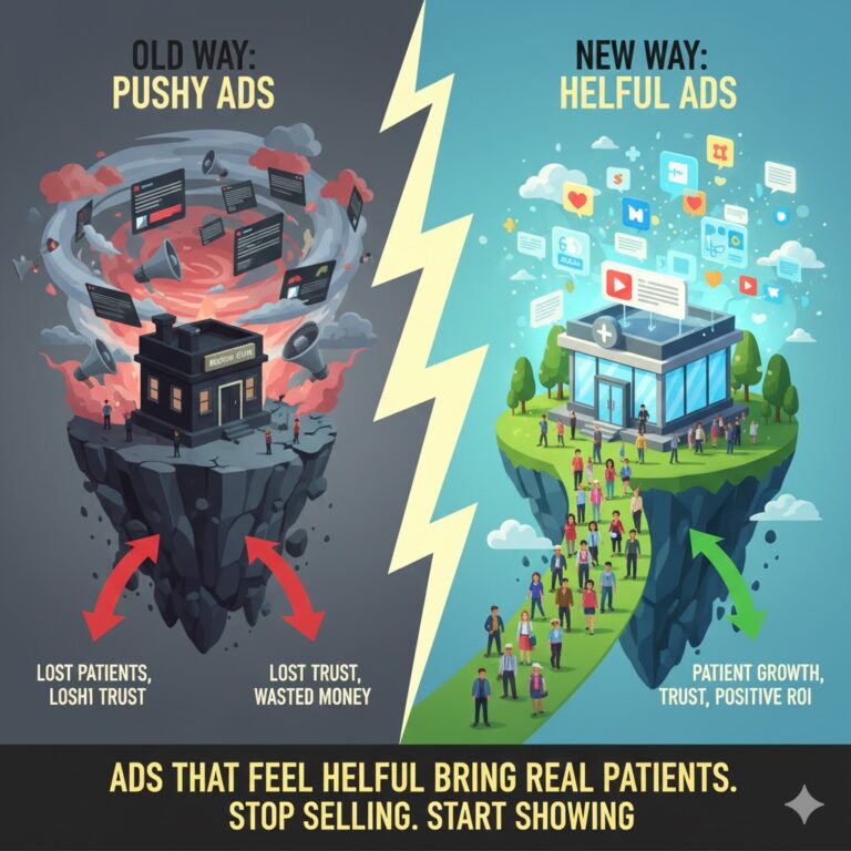 This works because patients trust you when you help them first. An ad that teaches is not pushing. It is giving. When you give information, people remember you. When you ask for money first, people run away.